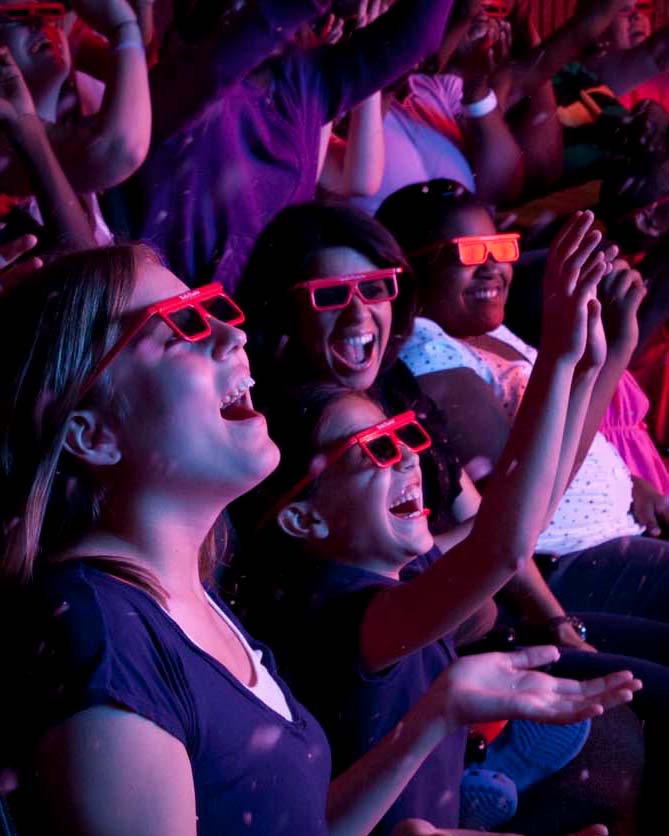 Our 50-seat 4D theater shows two films throughout the day with screenings every 15 minutes. Multi-sensory effects vary by film but can include bubbles, mist, scent, snow, wind and more!