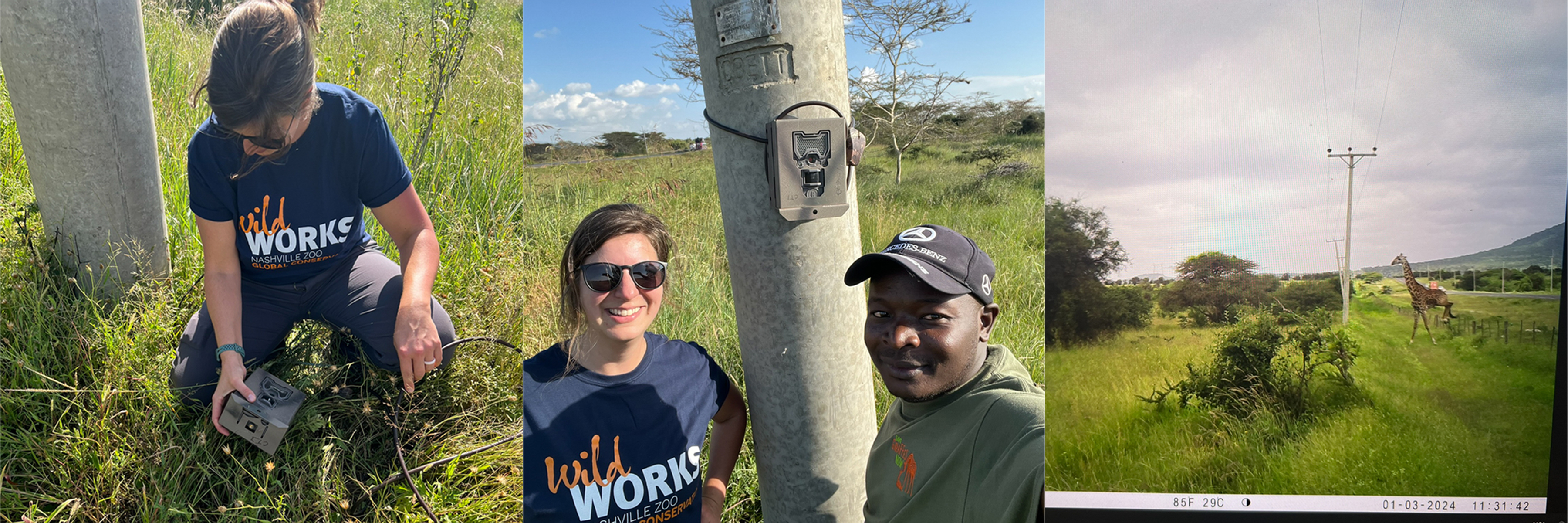 Left: Trap camera set up | Center: Jenna with Aggrey Chemwa, SGN field researcher | Right: Captured image of a giraffe crossing
