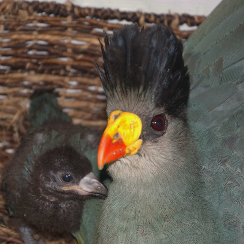 We are pleased to report another successful hatching from our Great Blue Turacos (Corythaeola cristata). The female chick arrived on June 10 and marked the fourth baby turaco to be successfully raised at Nashville Zoo since we acquired the species in 2009. Only a handful of zoos breed turacos, so each hatching is certainly cause for celebration.