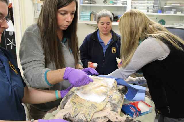 The day begins like any spa day. Soft towels are laid on a raised table, and Mrs. B is placed gently on her back. The old epoxy and fiberglass covering is taken off, and her shell is cleaned with disinfectant. Old scales that built up under the patch are removed, just like flaking off tough, dry skin. When the area is ready, a piece of fiberglass cloth is cut to exact size to cover the damaged area. A layer of epoxy is applied, and smoothed over with tongue depressors to ensure good contact and to remove bubbling. This process is repeated 3 times, until the strength of the patch is deemed adequate to stand up to the rigors of her aquatic environment. Through it all, sweet natured Mrs. Beasley is very patient, and her keeper stays by her side the entire length of the procedure (which is around 90 minutes). After a final 20 minute drying session with a hand-held blow dryer, she is ready to go back to her watery home in the Dwarf Caiman exhibit in Unseen New World.