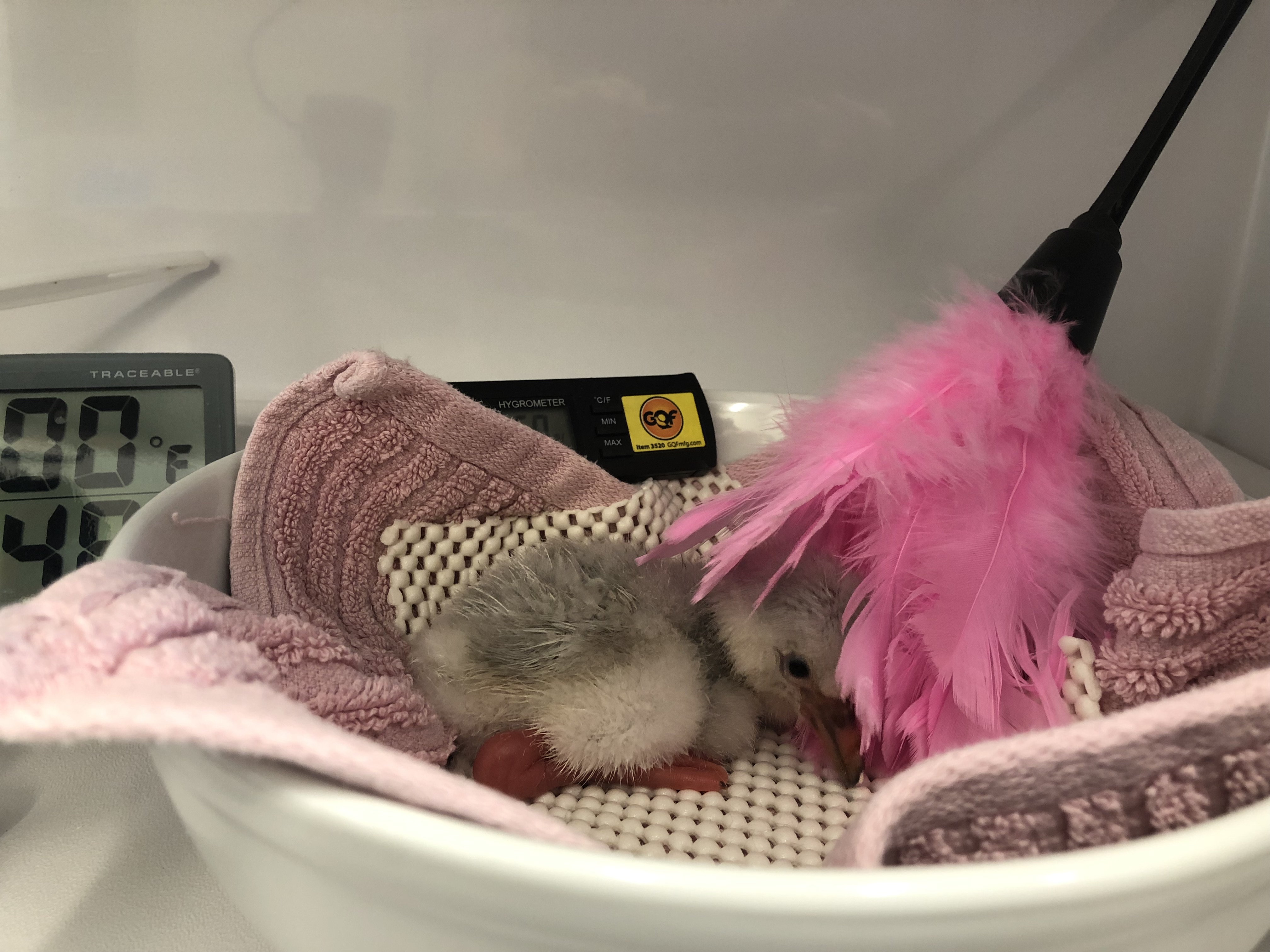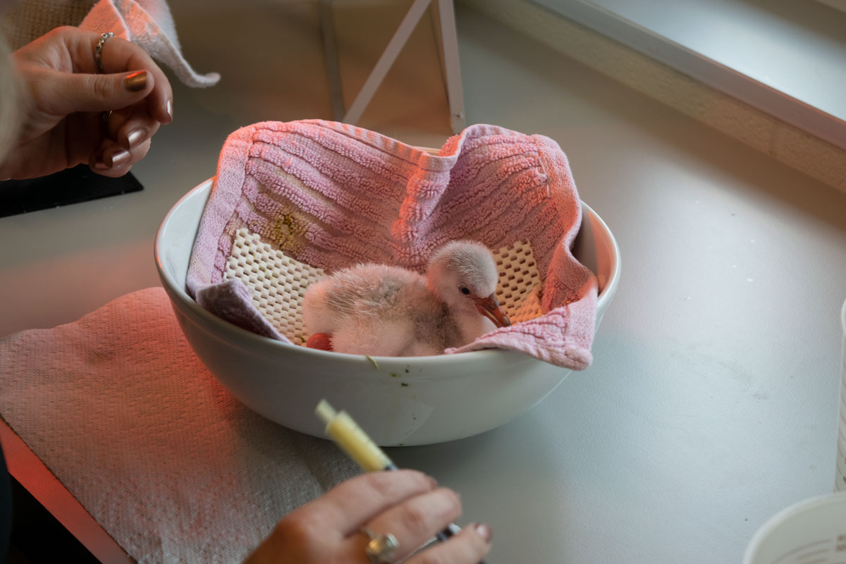 The chick will be held in the Veterinary Center Avian Incubation room, which is viewable by the public. Flamingo chicks grow fast, so guests are encouraged to visit sooner rather than later to see the chick while it's still small.