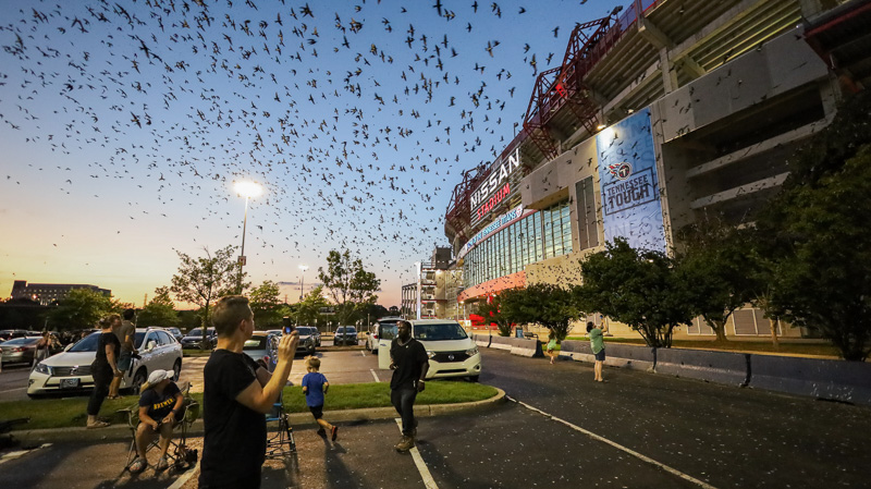 For those interested in viewing the Purple Martins before they travel south in late August and early September, it is free to see them around the pedestrian bridge located near Broadway, usually amassing in numbers about half an hour before sunset and descending into their roosting trees a little after the sun has gone down. Nissan Stadium has free street parking near H Lot for viewing. The public is invited to park and view the birds up close. To be as respectful as possible to our flighted friends, we recommend no flash photography, no loud noises, and do not attempt to climb the trees or harass the birds while they are settling in for the night. And as our recommendation to bird watchers, do not forget to bring a hat!
