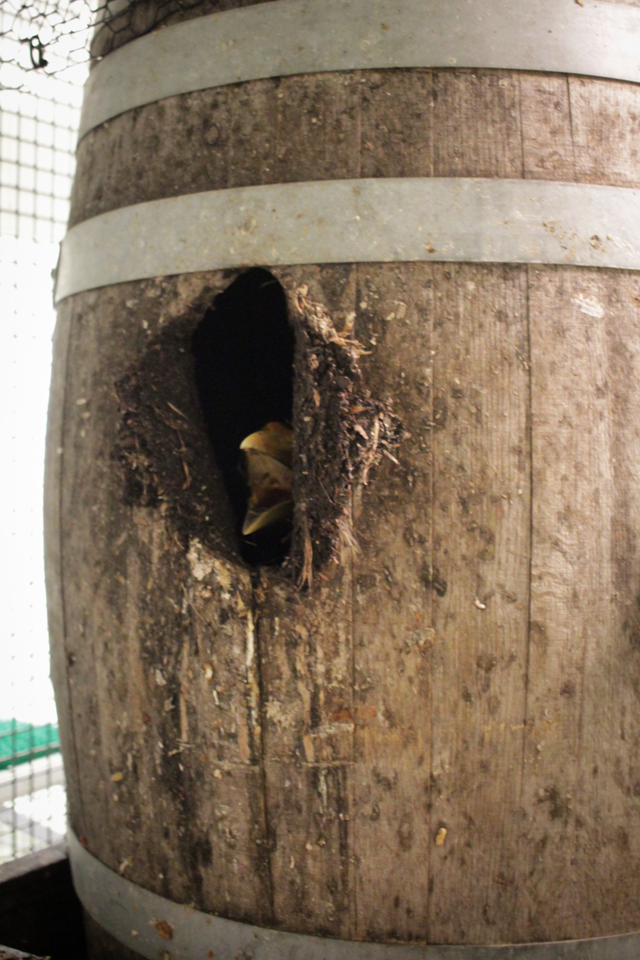 Nashville Zoo received 11 unused whiskey barrels this year. The avian staff modify the barrels for the hornbills by creating an entrance hole, which is roughly the size and shape of a football, as well as added a small access door in case they need to intervene and pull the chick for safety reasons.