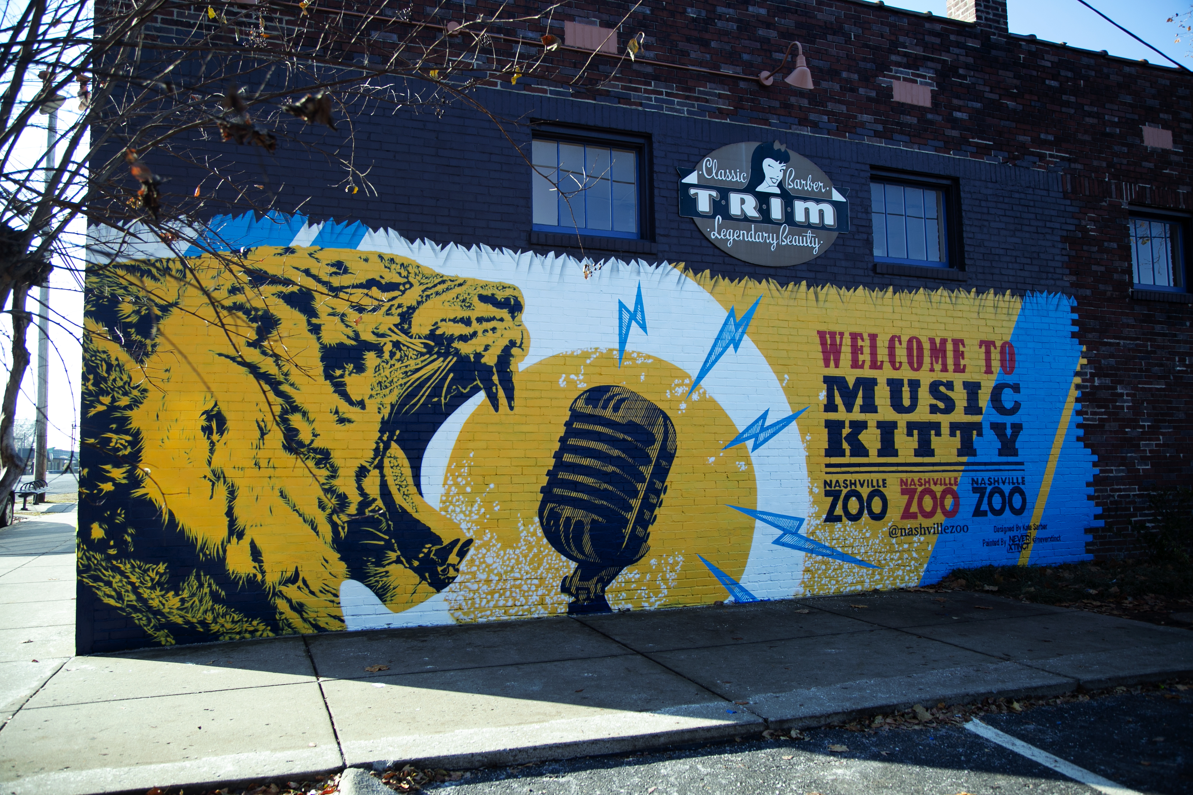 Taqueria del Sol and TRIM Nashville’s north-facing wall is now home to a Nashville Zoo mural featuring its iconic “Music Kitty” tiger with an accompanying microphone. This is the first mural that visitors see upon entering the 12 South shopping area.